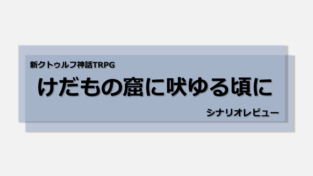 因習村ものシナリオとしては、NPCやイベントがやや薄味。序盤から中盤にかけての台本じみた本文は、よく言えば丁寧だが、悪く言えば同人シナリオよろしく茶番じみている。神話生物のチープさも気になる。