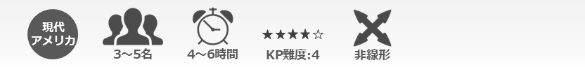 アメリカの田舎で超自然と対峙するシナリオ。派手な展開と場面をかき回すNPCでキーパーもプレイヤーも遊んでいて楽しい。